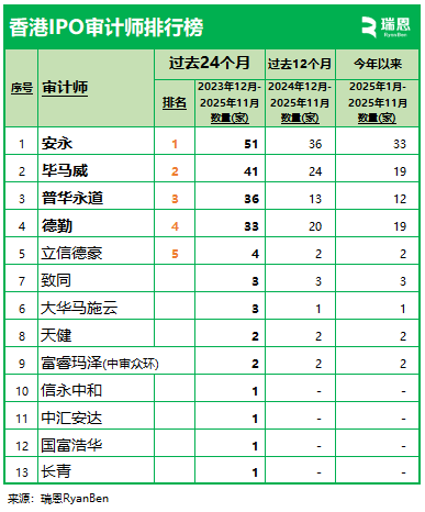 就过去12个月的数据来看,这13间审计师中的9间参与103家新上市公司的审计业务。