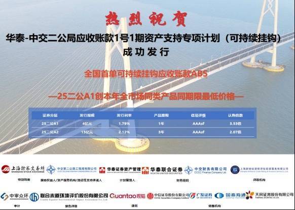 【大河财立方消息】11月26日消息,据中交二公局,11月24日鑫赢智投,中交二公局在上海证券交易所成功簿记发行“华泰-中交二公局应收账款1号1期资产支持专项计划(可持续挂钩)”。